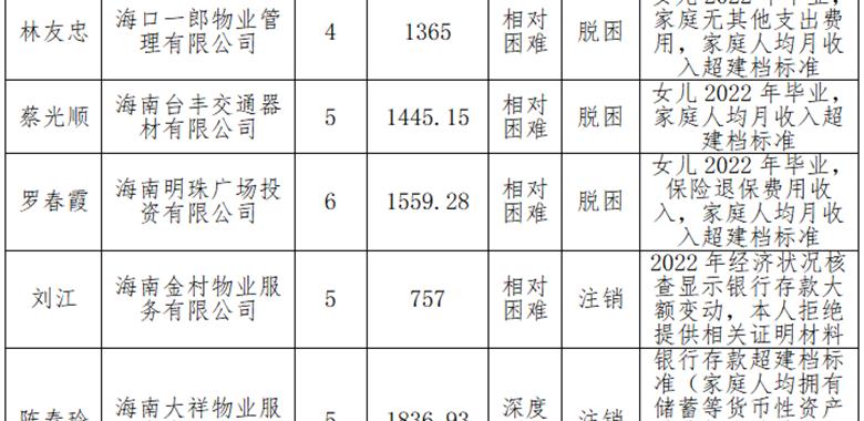 本次共有8户工会建档困难职工,达到脱困(注销)条件,予以退出。根据《海南省工会困难职工档案管理办法》《海南省建档困难职工脱困退出办法》等有关规定,现予以公示。公示期为2023年4月24日至2023年4月28日。如有异议的,请在2023年4月28日前向本单位工会反映。单位工会联系人:曹恒浩举报电话:66553658海南省财贸旅游烟草工会委员会  2023年4月21日;