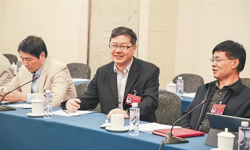 3月6日,全国政协十三届二次会议进行小组会议,讨论政府工作报告。图为住琼全国政协委员谢京(中)参加小组会议。 本报特派记者 张茂 摄