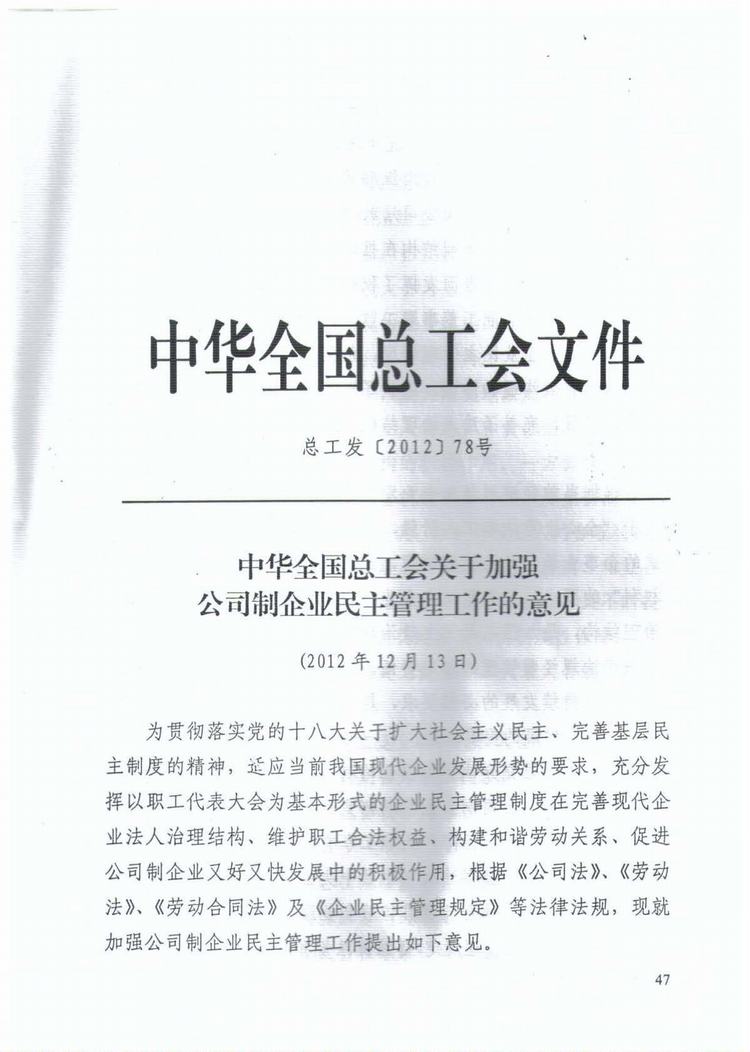 中华全国总工会关于加强公司制企业民主管理工作的意见(总工发[2012]78号)
