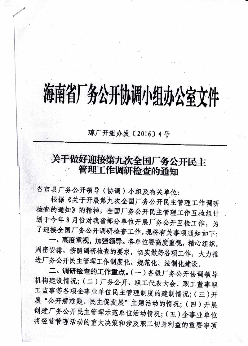 关于做好迎接第九次全国厂务公开民主管理工作调研检查的通知(琼厂开组办发〔2016〕4号)
